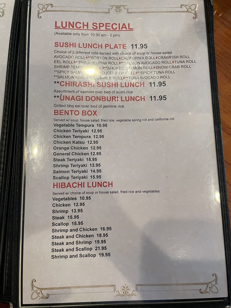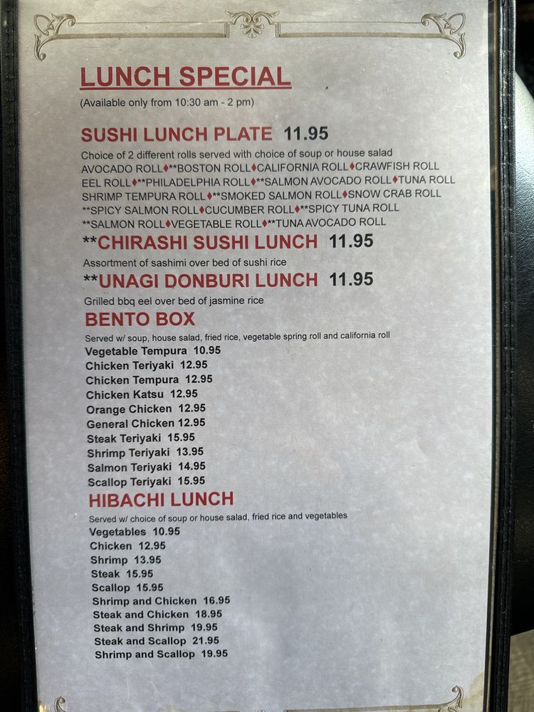 The menu showcases a variety of tempting starters, like the Baked Salmon Appetizer and Jalapeno Poppers, perfect for kicking off your culinary journey. For a hearty mid-day meal, try one of their Bento Box Lunch Specials, featuring flavorful meals like Chicken Teriyaki accompanied by soup and salad.